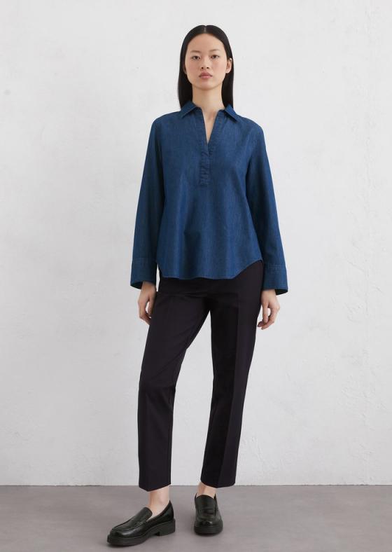 Diese lässige Schlupfbluse passt perfekt zum angesagten Jeans-Total-Look. Tipp: Besonders schön wirkt der Trend, wenn sich Ober- und Unterteil in der Waschung leicht unterscheiden. Die legere Bluse ist aus einer fließenden, weichen Bio-Baumwoll-Lyocell-Mischung in einem schönen Dunkelblau. Der Schnitt: locker, ausgestellt, ohne Verschluss und mit cooler abgerundeter Saumlinie. Mit modischem Kentkragen, tiefem V-Ausschnitt mit Blende, Rückenpasse mit Quetschfalte und langen Ärmeln mit Manschettenabschluss.